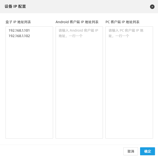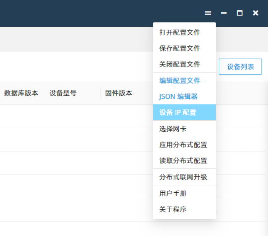 Ctrl键,点击软件右上角的菜单按钮,选择“设备 IP 配置”,在对话框中根据提示的格式填写设备的 IP 地址,然后点击“确定”按钮,再进行扫描设备操作,软件将会通过 HTTP 的方式获取设备信息。若将 IP 地址添加到列表后仍然扫描不到,请尝试重启设备(SSH 使用
