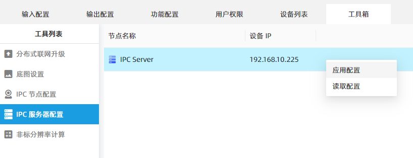 右键“IPC 服务器”节点,点击“应用配置”,将上一步中配置的信息应用到服务器。