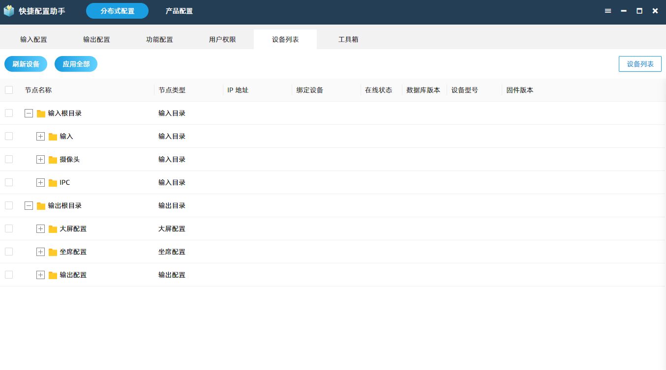 切换到配置助手的“设备列表”界面,根据实际需要点击“应用全部”或右键点击节点选择“应用配置”,将在“输入配置”和“输出配置”中配置的节点信息应用到分布式盒子和 PC 客户端中。
