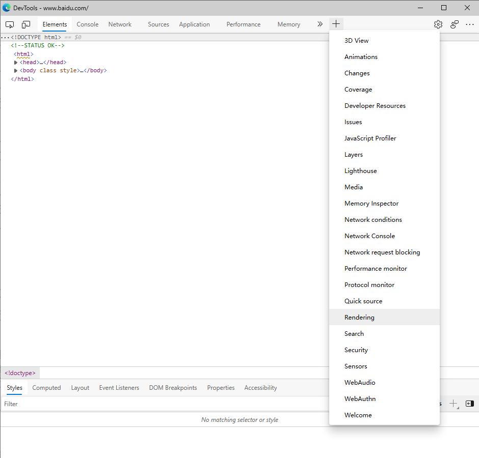 点击 DevTools 标签栏中的加号More Tools选择其中的“Rendering”。
