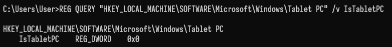 REG QUERY "HKEY_LOCAL_MACHINE\SOFTWARE\Microsoft\Windows\Tablet PC" /v IsTabletPC